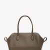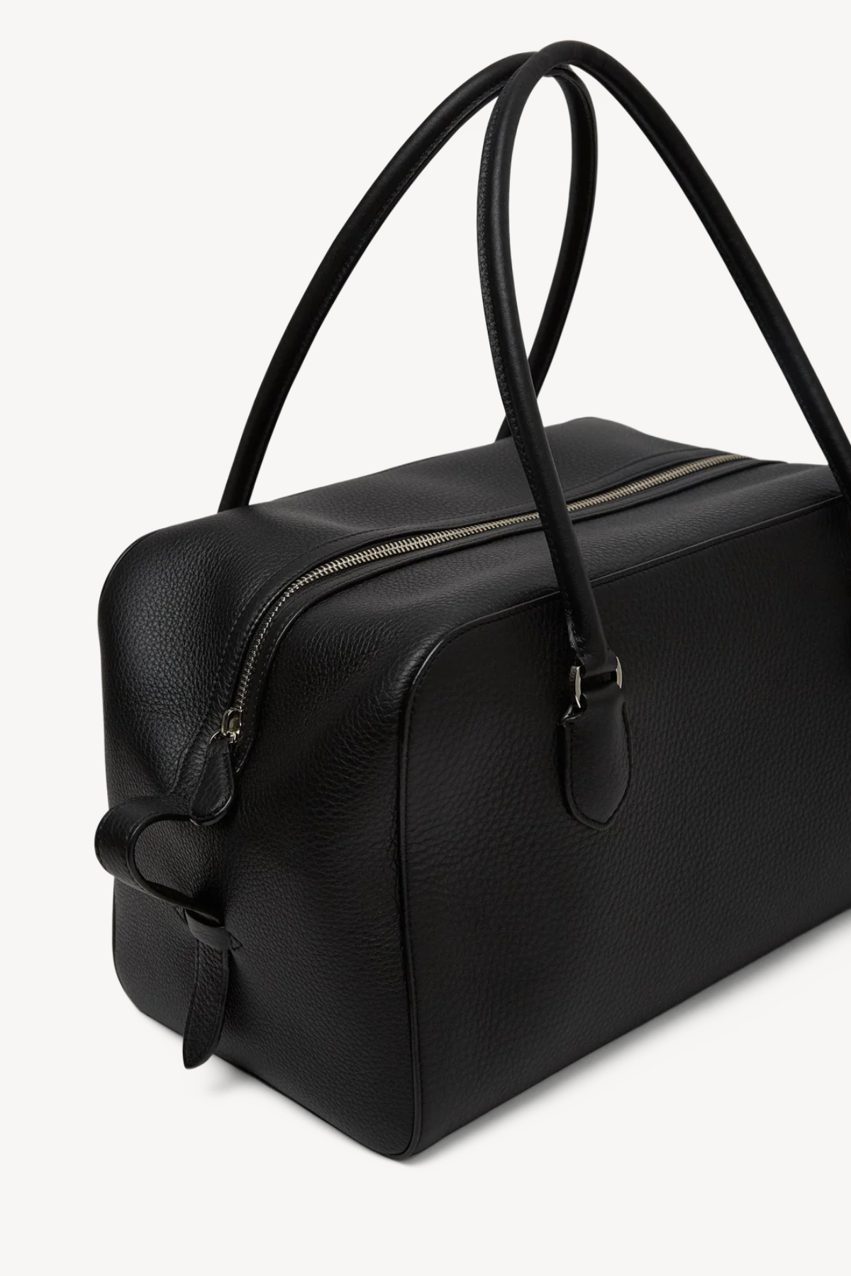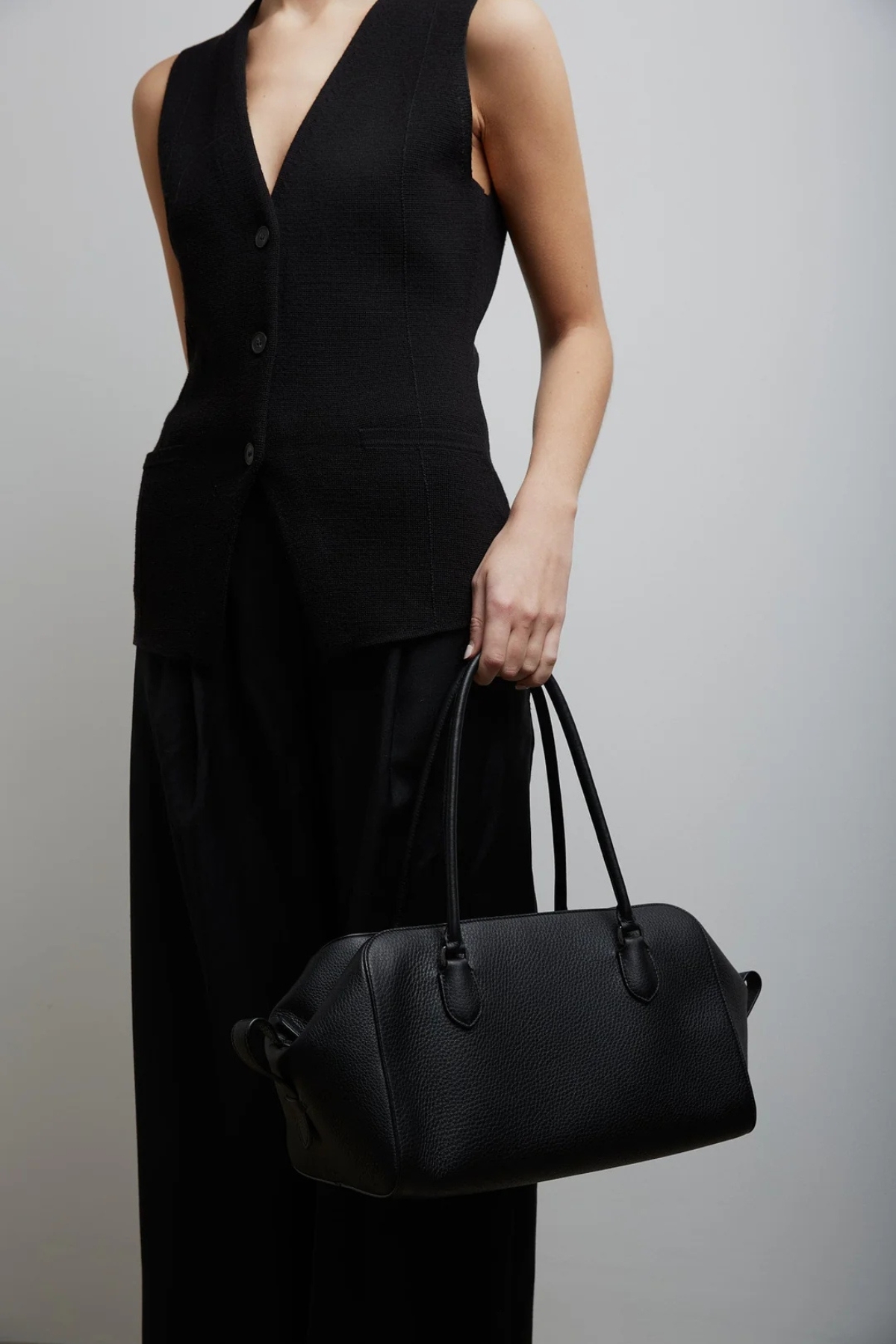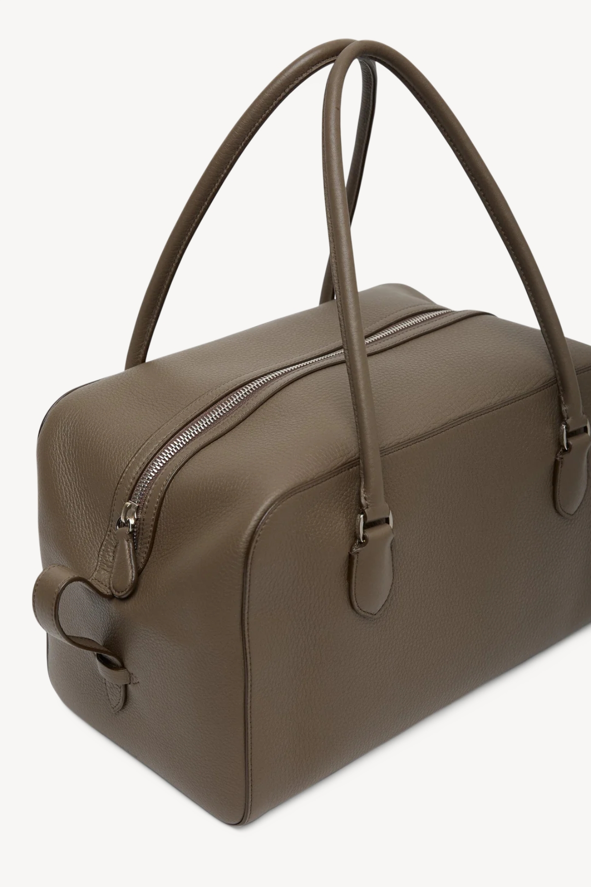 The Row Grey Leather EW Bowling Bag is crafted from grey leather with distinctive architectural pleats, tubular handles, and a zipper closure. Its classic bowling shape is complemented by a leather lining and silver-tone hardware. Dimensions (cm): 43 x 19 x 15.