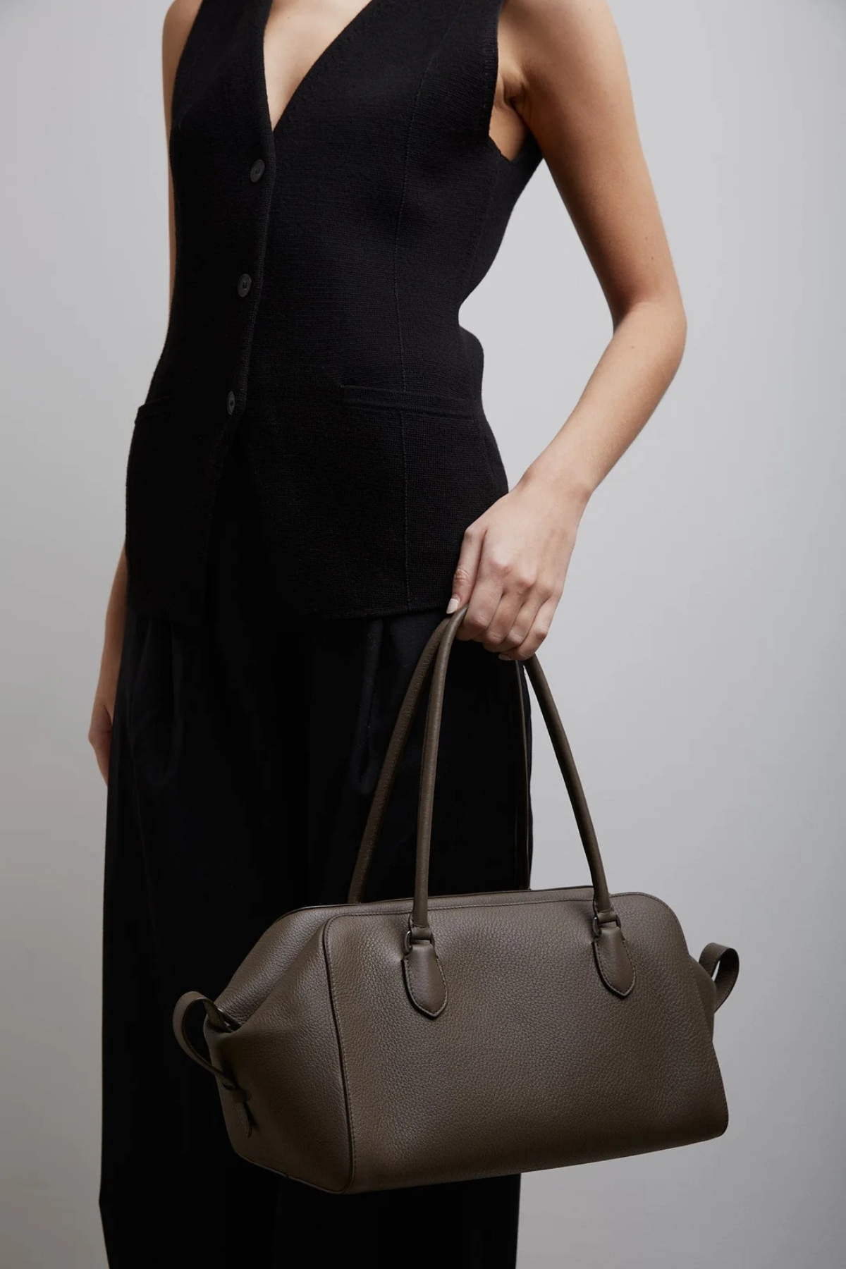 The Row Grey Leather EW Bowling Bag is crafted from grey leather with distinctive architectural pleats, tubular handles, and a zipper closure. Its classic bowling shape is complemented by a leather lining and silver-tone hardware. Dimensions (cm): 43 x 19 x 15.